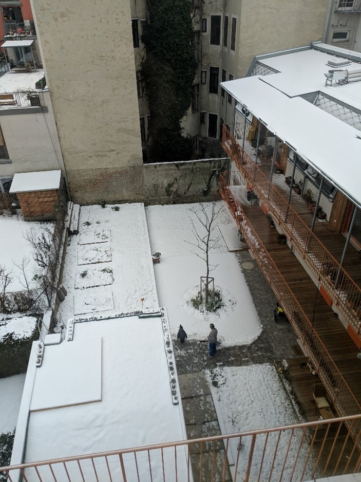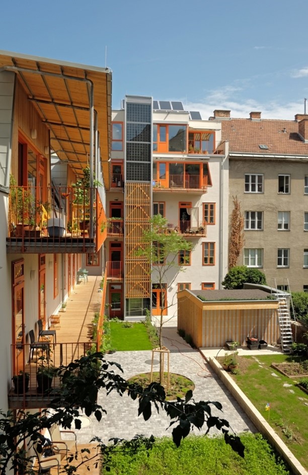 Die Ersten zwei Gebäude werden durch Erdwärmesonden, welche im Innenhof errichtet wurden, geheizt. Die Sonden werden im Sommer durch die Abwärme der Kühlung der Wohnräume sowie durch thermische Solarkollektoren am Dach regeneriert, wodurch ein hohe Jahresarbeitszahl von 1:6 erreicht wird, das heißt: mit 1 kWh Strom können 6 kWh Wärme erzeugt werden. Die Leitungen wurden bereits an die Grundstücksgrenze gelegt, sodass sich später weitere Häuser anschließen können.