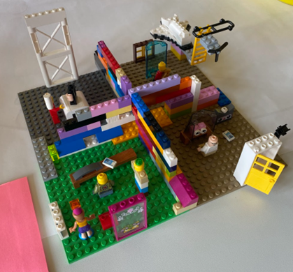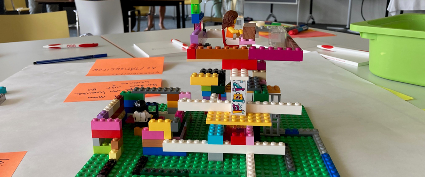 IdeaLab an Design Thinking-Prinzipien orientiert: Design Thinking ist ein Ansatz zur Entwicklung innovativer Lösungen, die in einem (klassischerweise interaktiven) Prozess der Problemdefinition, Ideengenerierung und Prototypentestung erdacht und verfeinert werden. Für das IdeaLab wurde ein Set an Spielbausteinen, Buntpapier, Stiften und sonstigen Bastelmaterialien zur Verfügung gestellt, mit dem die Teilnehmenden ihre Entwürfe entwickeln und gestalten konnten.