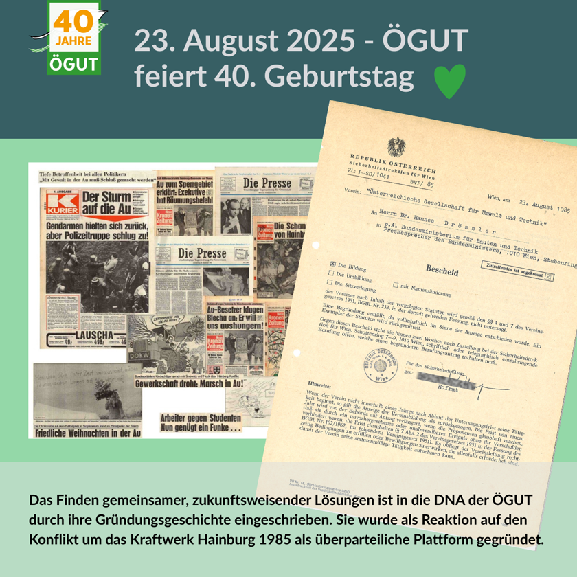 Am 23. August 1985 war es also offiziell: Die ÖGUT wurde als überparteiliche Plattform (als Verein) gegründet – und zwar als Reaktion auf den Konflikt in der Hainburger Au.