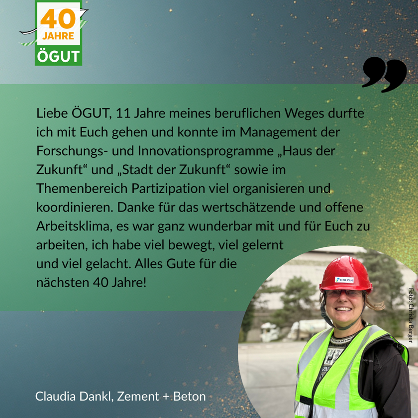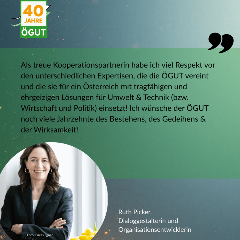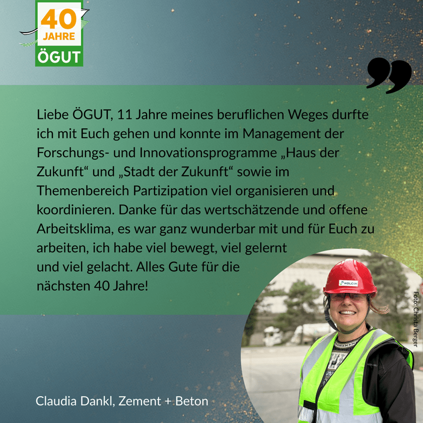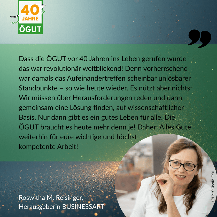 Kurz zusammengefasst: Wir haben Know-how und Grundlagenwissen erzeugt, Innovationen auf den Weg gebracht, große Programme und Projekte für Ministerien geleitet, neues Wissen über mehrere Jahre entwickelt und in die Umsetzung gebracht sowie zukunftsweisende Netzwerke aufgebaut. Und das nicht alleine – Erfolge erreicht man immer nur gemeinsam! Wir feiern 40 Jahre ÖGUT auch dank des starken Teams und Netzwerks an Partner:innenn, Auftraggeber:innen, Mitgliedern und Begleiter:innen. Danke!